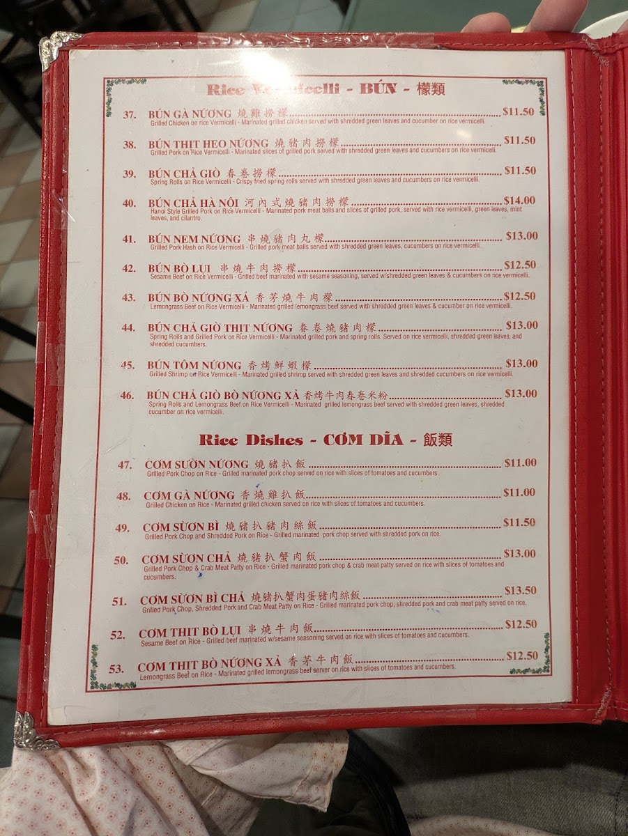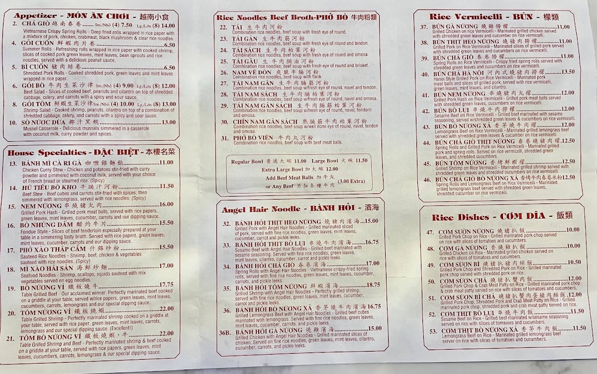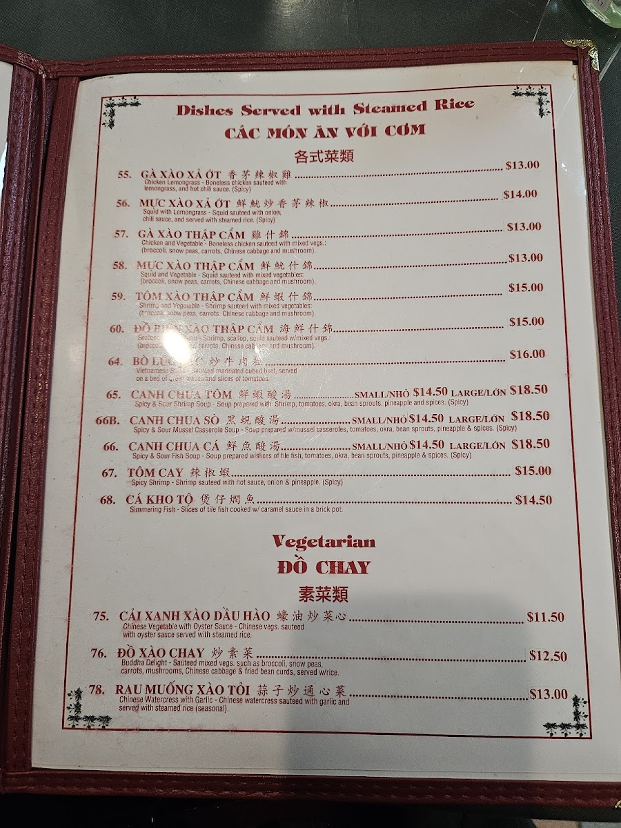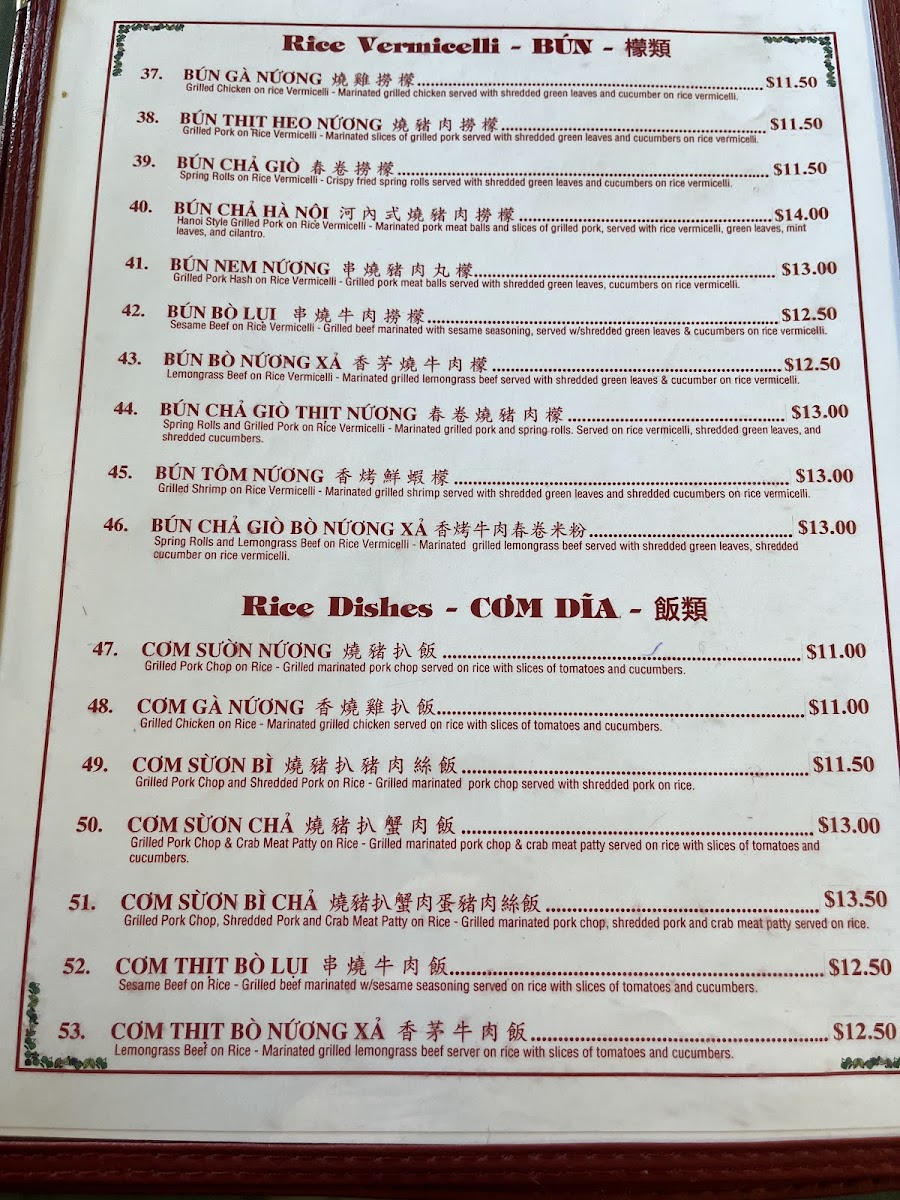 The menu at Phở Bằng offers a variety of traditional Vietnamese dishes, focusing primarily on pho and rice-based meals. The selection includes various types of rice noodle beef soups featuring cuts like brisket, tendon, eye of round, and meatballs, allowing diners to customize their pho experience. In addition to pho, the menu contains multiple rice dishes such as grilled pork chop, shredded pork, grilled chicken with lemongrass, and curry chicken served over rice. There are also rice dishes cooked in clay pots that combine choices of chicken, pork, beef, or seafood with mixed vegetables.